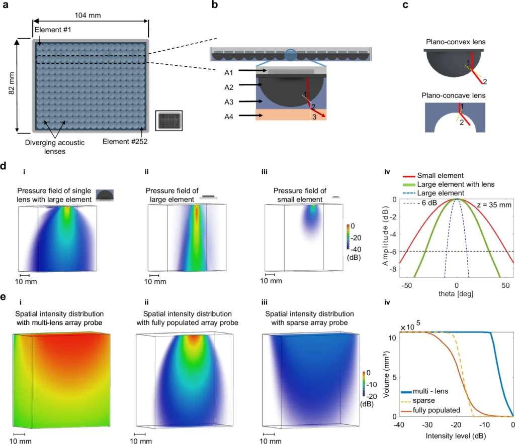 Il cuore dell’innovazione è una nuova sonda ecografica “multi-lente”. Invece di migliaia di piccoli elementi — costosi e complessi da gestire — utilizza poche centinaia di elementi più grandi accoppiati a piccole lenti acustiche che diffondono gli ultrasuoni in modo ottimale. Così si ottiene una copertura molto ampia del tessuto, con una sensibilità superiore e una risoluzione sorprendente: fino a circa 125 micrometri, più di dieci volte meglio degli ecografi clinici tradizionali.